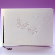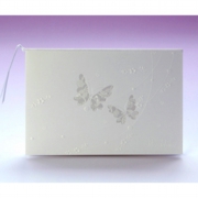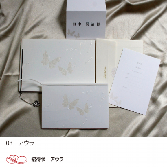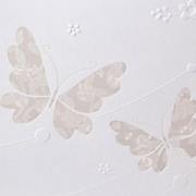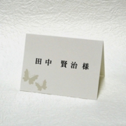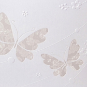 純白のウェディングドレスをイメージさせる白い席次表。 角度によって濃淡を変えるホログラムの 蝶模様はまるでシルク生地のようです。