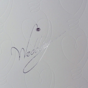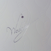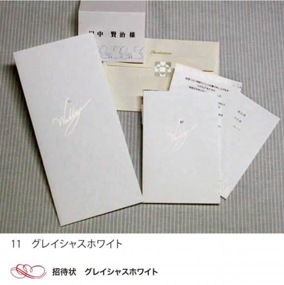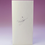 真っ白な台紙にハートのエンボス加工、 キラキラの大きめな宝石飾りがステキ。 内ポケットに席次表をはさむ個性的なタイプです。
