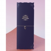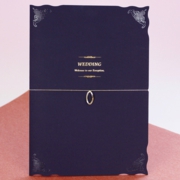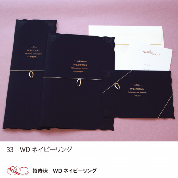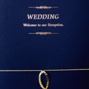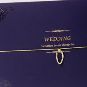 濃紺色のお洒落な型台紙にゴールドの浮き文字が入って、 落ち着いたデザイン。 ゴールドリングのチャームがアクセントです。 マットな質感も印象的な高級感のある招待状です。