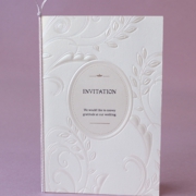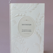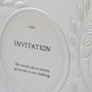 オフホワイトに同系色の大胆な模様を贅沢に型押し&箔加工 しています。 豪華さと品の良さが調和した、 シルクドレスのような印象の高級感あふれる招待状。