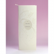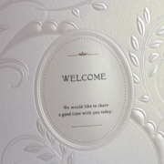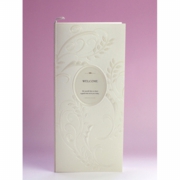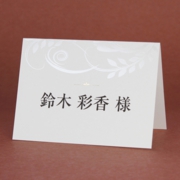 オフホワイトに同系色の大胆な模様を贅沢に型押し&箔加工し ています。豪華さと品の良さが調和した、 シルクドレスのような印象の高級感あふれる席次表。