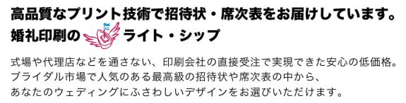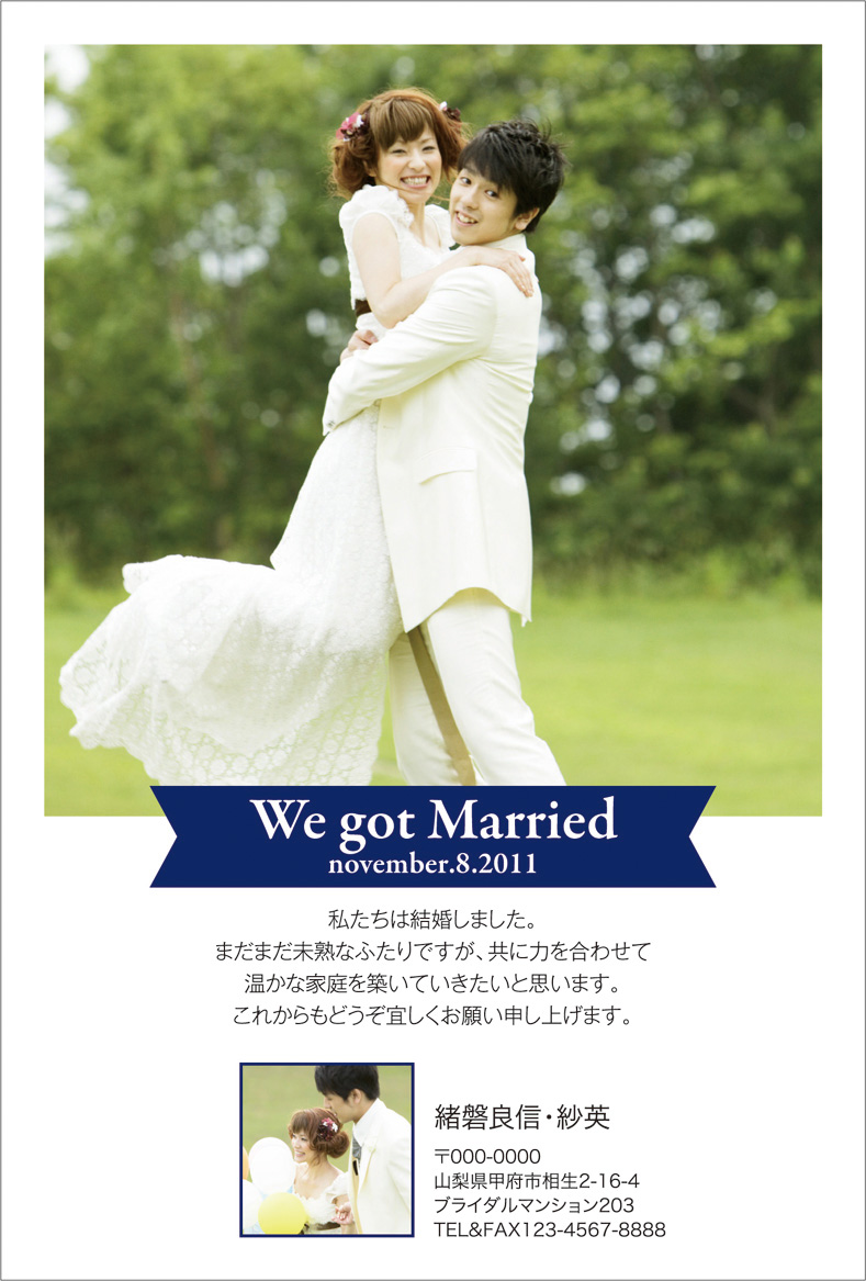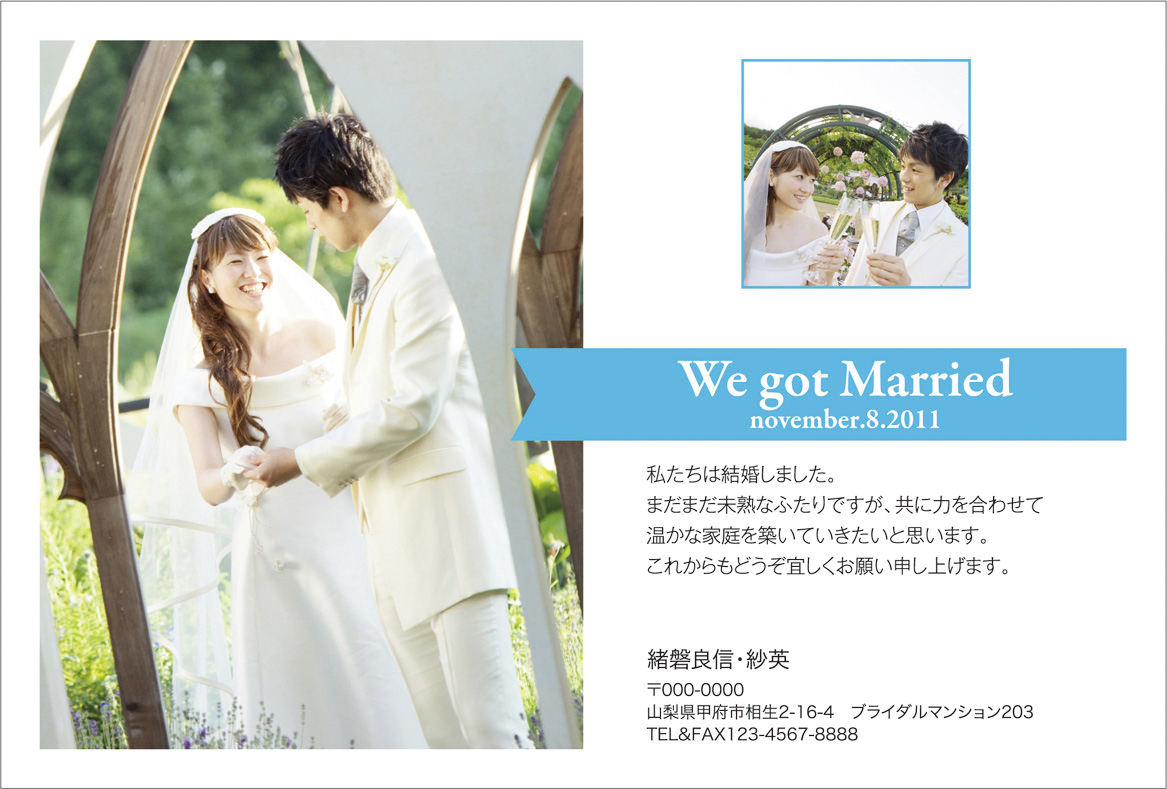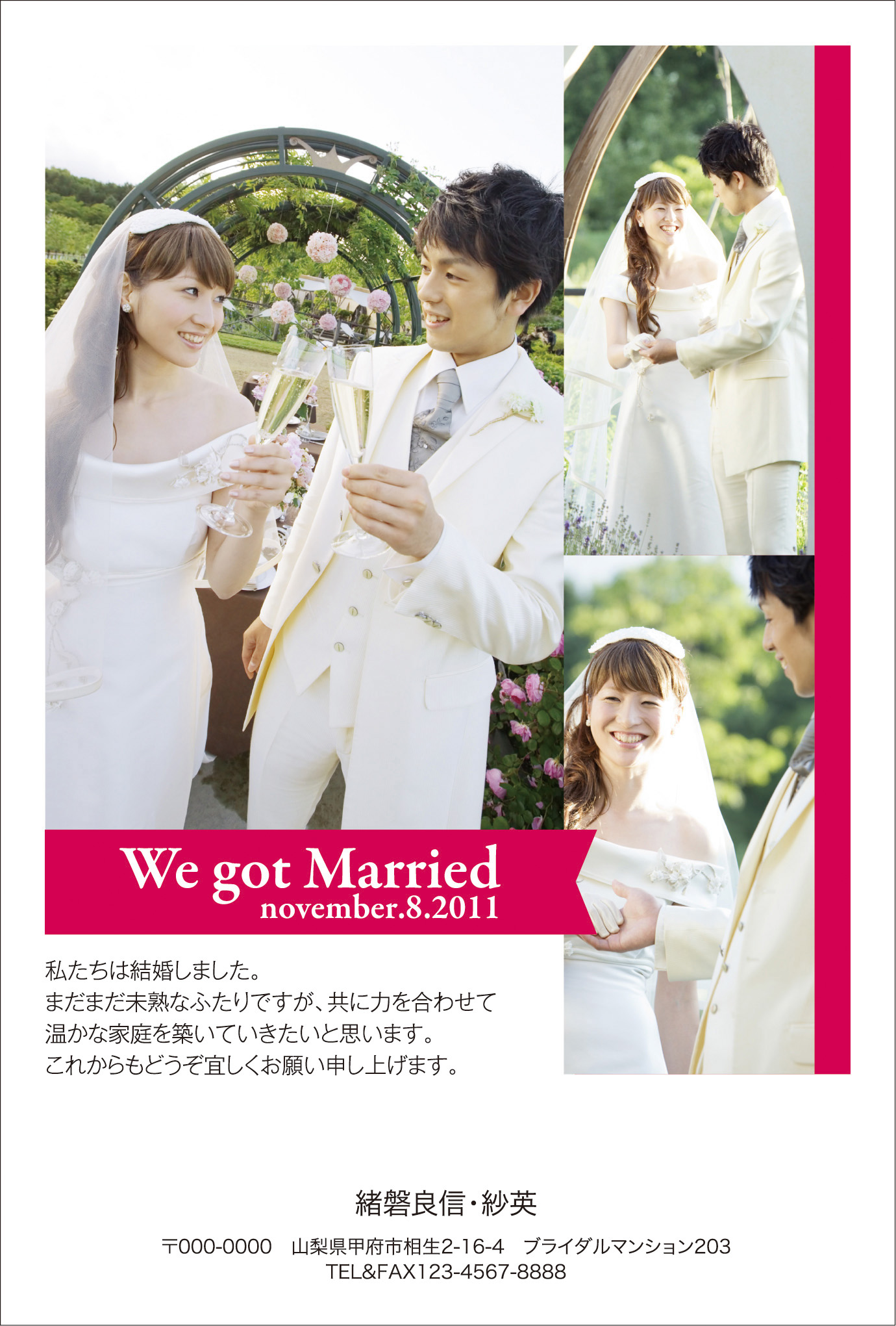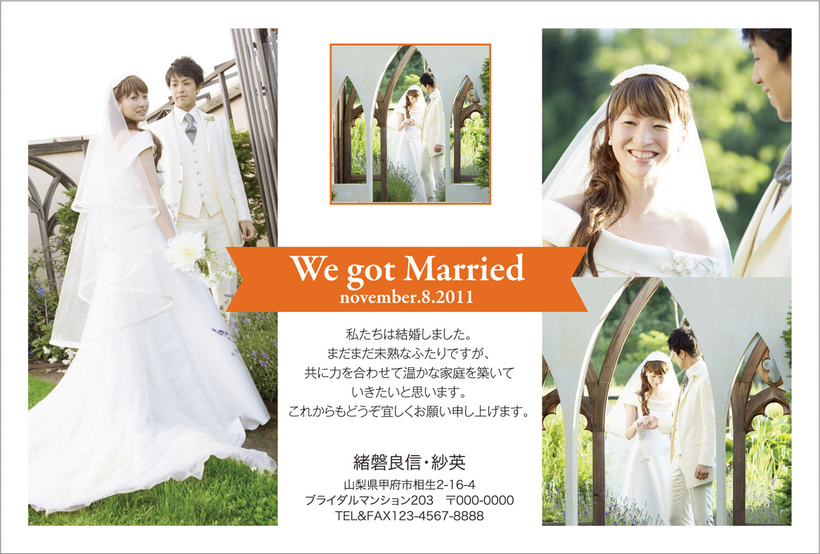 [01] ディズニー [02] コンプリートブラウン [03] コンプリートパール [04] ブリリアントクローバー [05] アジュール [06] ラフィナート [08] アウラ [09] フィオーレローズ [10] フィオーレパール [11] グレイシャスホワイト [12] グレイシャスブラック [14] オーシャン [15] アルティス [16] SAKURAさくら [17] メルレット [18] ダリアイエロー [19] ダリアパープル [20] グランホワイト [21] グランブラウン [22] こもれび さくら [23] こもれび うぐいす [33] WDネイビー [34] WDパール [37] ロマネスクブロンズ [38] ロマネスクパール [39] ASUKAピンク [40] ASUKAレモン [42] ミカーレ [24] 和音(わおん) [25] JAPAN-赤 [26] JAPAN-緑 [27] JAPAN-紫 [30] 喝采(かっさい) [31] 振袖(ふりそで) [32] 留袖(とめそで) [44] 優婉(ゆうえん) [45] みのり [47] つばさ ゴールド [48] つばさホワイト ご結婚報告オリジナルカード ご結婚の報告ハガキや年賀状もハイクォリティで、しかもリーズナブル。おふたりの写真が入ったオリジナルのご挨拶カードを素敵にお作りします。 オリジナルプリントはコチラ ●オリジナル招待状・席次表 既製の台紙以外にも自由なデザインの招待状や席時表をリーズナブルにご利用いただけます。お二人のイメージやご要望をお知らせいただければプロのデザイナーによる世界でたったひとつの思い出をお作りいたします。お気軽にお問い合わせください。 メールでのお問い合わせはコチラ ●フォト入ご挨拶状も承りますご結婚報告やお子様の誕生報告などをたいへんお安くお作りいただけます。当社で招待状をお作りいただいた方には購入者特典もご用意しておりますので是非ご利用ください。 TEL.055-233-5033 メールでのお問い合わせはコチラ